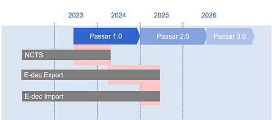 Le passage du NCTS à Passar aura lieu entre le 1er juin et le 31 octobre 2023. Le passage d'e-dec exportation à Passar débutera le 1er octobre 2023 et devra être achevé au plus tard le 30 juin 2025.